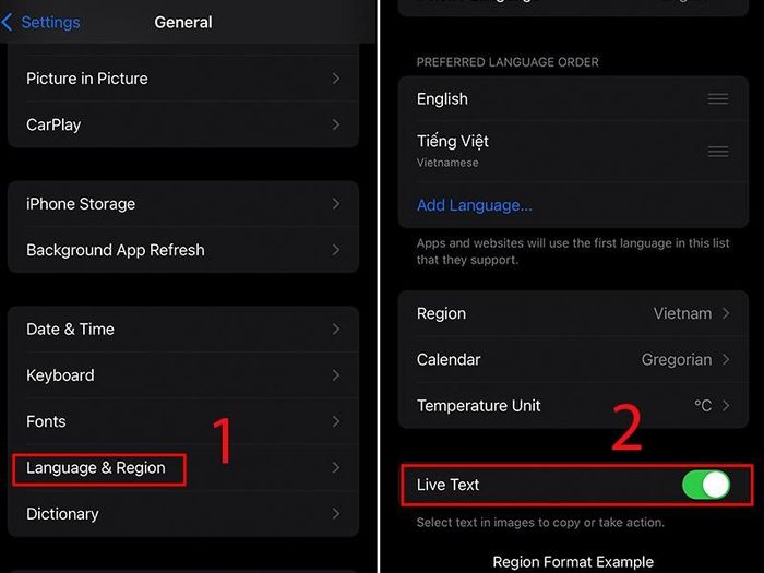 Step 1: Access 'Settings' on the main interface and select 'General'. Then, choose 'Language & Region' and enable Live Text.