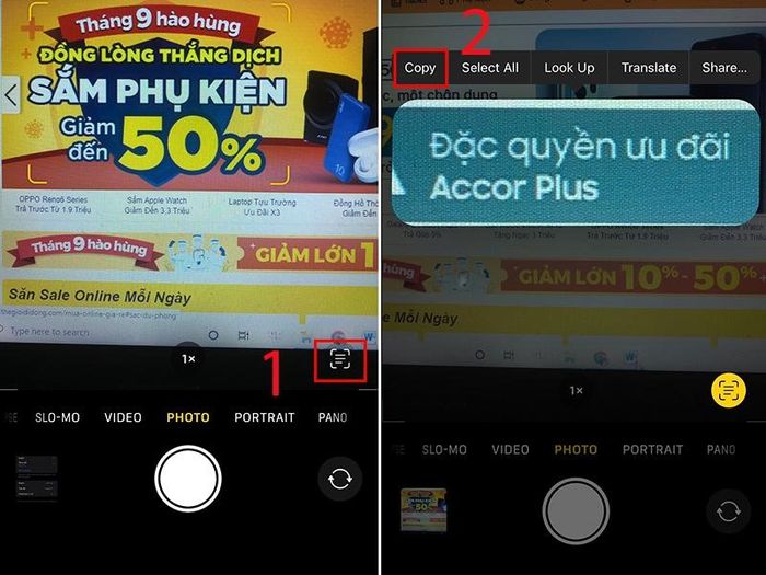 Step 2: Open the Camera app and align it with the document you want to scan with iPhone. Then, select the Scan button at the bottom right corner of the screen. Finally, choose and press Copy for the portion you wish to scan.