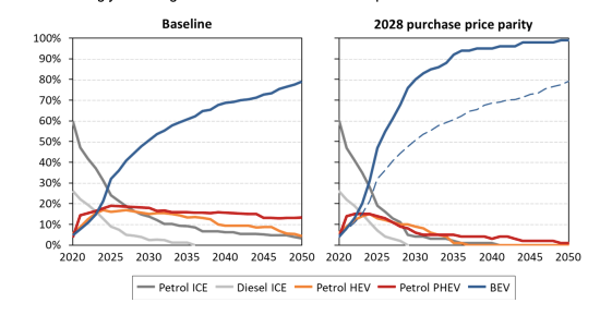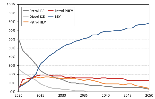 Tương ứng, dự kiến nhu cầu của người tiêu dùng đối với xe điện (BEVs) sẽ trở nên lớn hơn so với bất kỳ loại động cơ nào khác vào năm 2025. Dự kiến sẽ đạt 50% vào năm 2030 và 80% vào năm 2050.