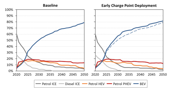 On the left: the projected EV sales growth based on lower upfront cost. On the right: the projected EV sales growth with increased public charging infrastructure. (Credit: Element Energy)Tuy nhiên, ở các quốc gia mà quyền truy cập cả vào điểm sạc riêng tư và công cộng bị hạn chế (ví dụ như Tây Ban Nha, Ý và Ba Lan), triển khai hạ tầng bổ sung được dự kiến sẽ mở khóa nhu cầu tiềm ẩn đáng kể.