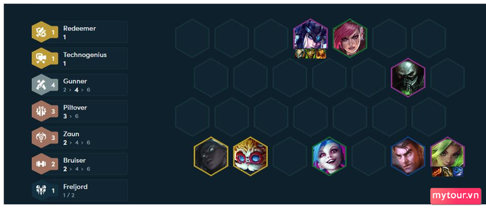 - Tộc/Hệ: 3 Piltover - 4 Bắn Tỉa - 2 Đấu Sĩ - 2 Zaun