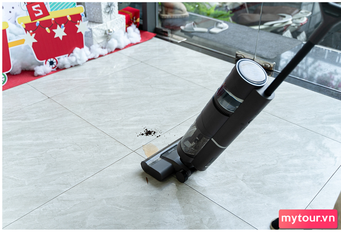 Thử nghiệm hút cặn cà phê và lau nước cam đổ ra sàn. Sàn trở nên sạch sẽ chỉ sau một lần đẩy máy. Dreame H12 Core hút sạch mọi loại bụi, chất dơ, và chất lỏng một cách hiệu quả, không lan rộng. Đối với khu vực có nhiều rác như lá cây, nên quét sơ trước rồi dùng máy để lau dọn sẽ hiệu quả hơn.