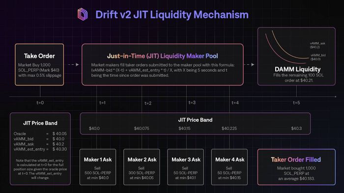 Đấu giá Just-In-Time (JIT) là một phương pháp cung cấp thanh khoản cho các nhà tạo lập thị trường (MM) trên Drift Protocol. Khi một người dùng (Taker) đặt lệnh thị trường, hệ thống tự động kích hoạt một phiên Dutch Auction với giá khởi điểm, giá kết thúc và thời gian cụ thể.