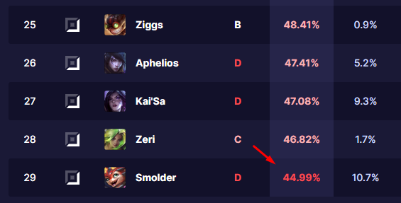 Riot rất lạc quan về Smolder sau khi ra mắtTuy nhiên, Smolder vẫn có nhiều điểm yếu, đặc biệt là ở đầu trận, dẫn đến tỷ lệ thắng thấp. Theo U.gg, Smolder chỉ có 44.99% tỷ lệ thắng ở mức rank Bạch Kim trở lên, là con số thấp nhất trong số các Xạ Thủ hiện tại của LMHT.