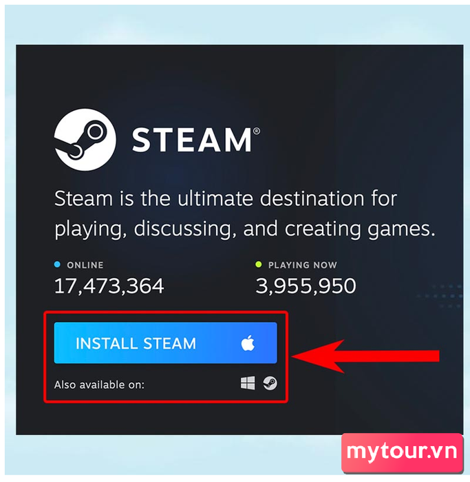 Bước 2: Nhấn INSTALL STEAM với biểu tượng Apple nếu bạn sử dụng MacOS hoặc chọn biểu tượng Windows nếu bạn sử dụng Windows (lưu ý: bài viết này sử dụng MacBook).