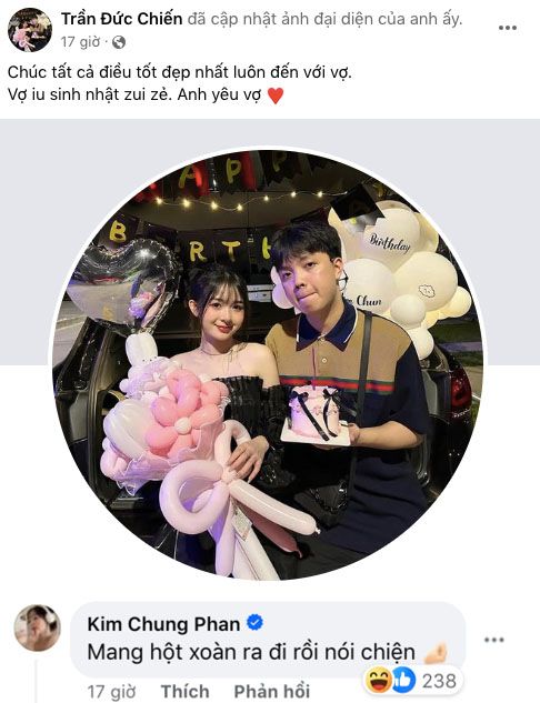 Mới đây, ADC lại khiến người hâm mộ phát cuồng khi chuẩn bị sinh nhật cho nữ TikToker với một bữa tiệc lãng mạn trên chiếc xe hơi. Chia sẻ trên trang cá nhân, ADC viết: 'Chúc em luôn hạnh phúc và may mắn. Sinh nhật vui vẻ nhé em yêu. Anh yêu em'. Được ông xã quý trọng, trong dịp đặc biệt này, Kim Chung Phan mạnh mẽ thể hiện: 'Mang nhẫn ra rồi nói chuyện'.