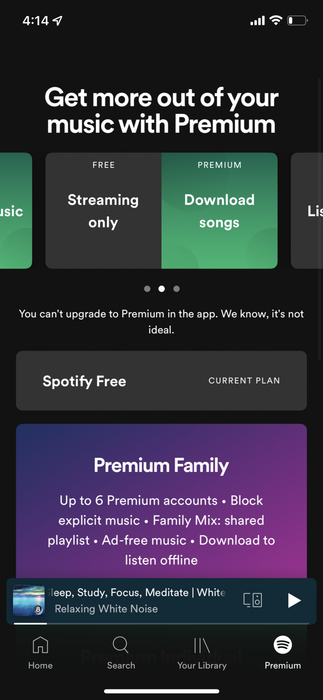 Spotify doesn’t have an option to upgrade to the premium plan inside the iPhone app to avoid App Store feesThật đáng tiếc, những ứng dụng này không được phép thông báo cho khách hàng về các phương thức thanh toán thay thế như đăng ký gói cao cấp trên web.