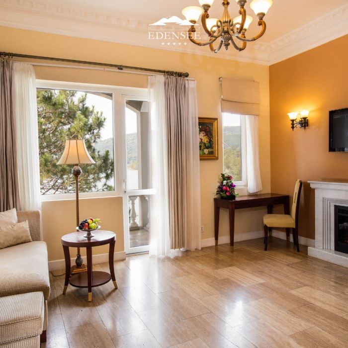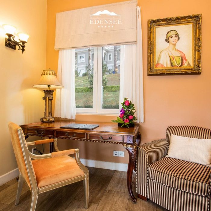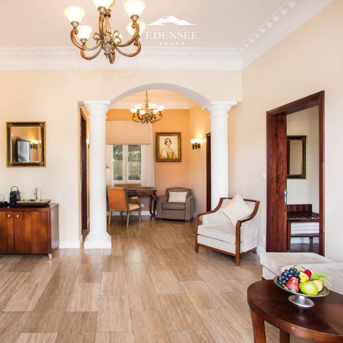 Camellia comprises 6 villas by Tuyen Lam Lake, totaling 24 Suite rooms, facing the lake and garden. Each Suite has an area of 70 square meters divided into 2 types: 8 Junior Suites are rooms for guests needing private space for both relaxation and work, entertaining guests. 6 Eden Suites are suitable for families with children needing separate sleeping areas.