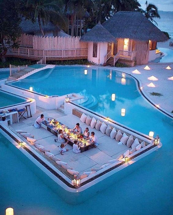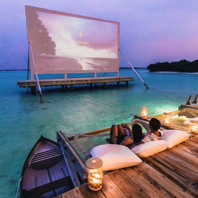 At the heart of the resort lies a restaurant, a fitness center, a spa, a kids' club, and an outdoor water slide. Additionally, the resort boasts an outdoor cinema system designed right on the water surface, regularly screening famous movies. This is one of the most exciting experiences for couples traveling here.