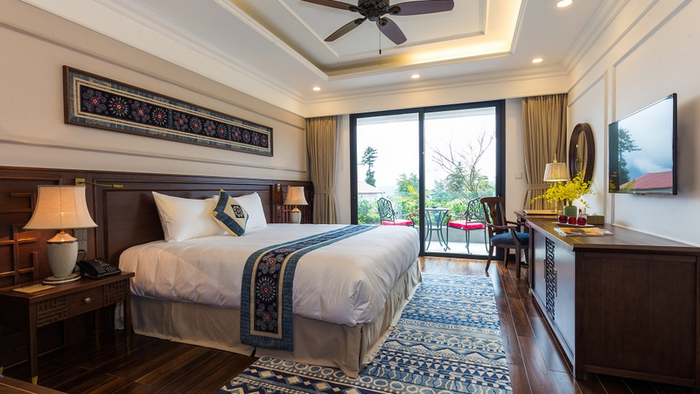 Moreover, the rooms here are equipped with luxurious amenities, decorated with ethnic motifs of H'mong, Dao, and Xa Pho. The room decoration art bears a strong local style with all wooden furniture providing a cozy feeling, allowing guests to truly experience the local culture.