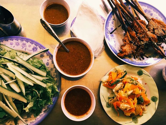 This restaurant is located in an alley, similar to Vuon Xua, offering dishes like grilled pork vermicelli, cao lau, grilled skewers, and Quang noodles priced between 35,000 VND and 45,000 VND.