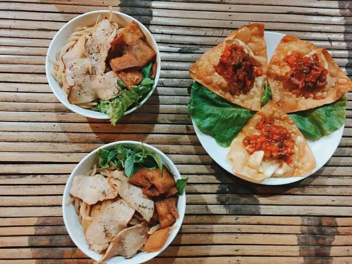 This restaurant is located in an alley with a diverse menu including dishes like cao lau, stir-fried Quang noodles, wontons, etc. Prices range from 35,000 VND to 50,000 VND on average. The restaurant has a cute yellow cat that loves to greet guests.