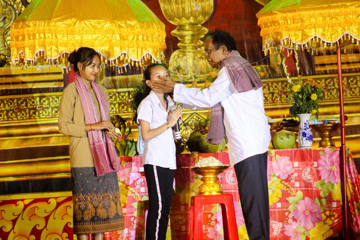 All the ceremonial offerings are beautifully displayed on a table in the courtyard, where family members gather to pray and express gratitude to the spirits. Subsequently, another significant ritual unfolds, involving monks, respected elders, or the eldest person in the family selecting small portions of each item, always accompanied by flattened rice. The host then feeds each child, gently patting their backs while asking about their wishes. Khmer people believe that the children's responses signify the faith and motivation of the adults for the upcoming year.
