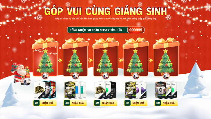 Chào đón Mega Xmas Fest, các HLV chỉ cần hoàn thành những nhiệm vụ đơn giản để nhận lượt gắp bóng miễn phí. Mỗi lượt gắp mang lại những phần quà ngẫu nhiên từ quả bóng.