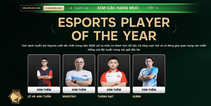 - Vận động viên Esports xuất sắc của năm (Esports Player of the year) không thể không kể đến những tài năng trẻ đã tạo ra cơn bão trong cộng đồng Esports Việt như Lê Hà Anh Tuấn (EZ Gaming), Subin (Seven Galaxy), Maestro (XMEN), Thành Đạt (T4M).