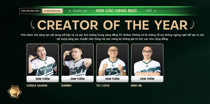 Giải thưởng Nhà sáng tạo của năm là danh hiệu cao quý nhất trong cộng đồng FC Online, nhằm vinh danh những nhà sáng tạo có sức ảnh hưởng lớn và nội dung nổi bật. Đây là sự ghi nhận cho những đóng góp tích cực và đầy cảm hứng của họ đối với cộng đồng, với sự tham gia của những tên tuổi đình đám như Rambo, Vodka Quang, Tú I Love và Bình Be.