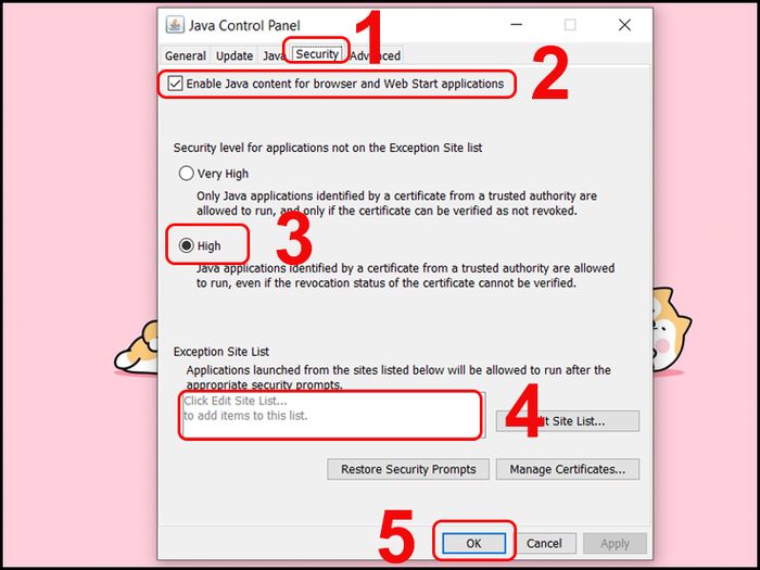 Chọn tab Bảo mật > Kiểm tra xem bạn đã tích chọn Kích hoạt nội dung Java cho trình duyệt và ứng dụng Web Start chưa, đặt cấp độ bảo mật lên Cao và kéo file JAR cần mở vào Danh sách trang ngoại lệ > Nhấn OK.