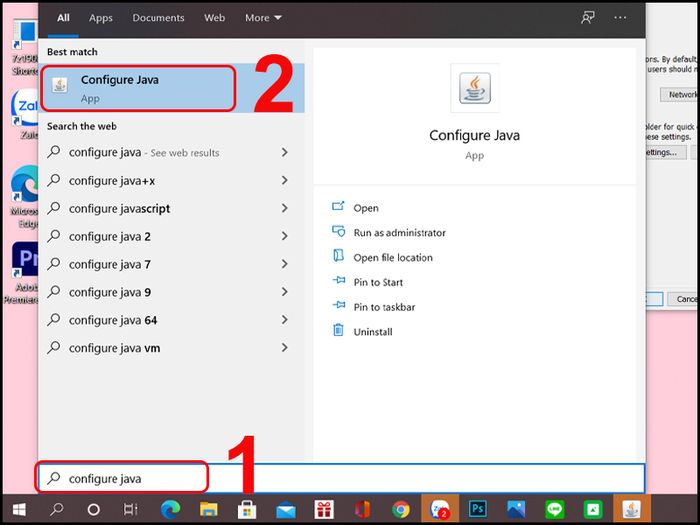 Mở menu Start > Gõ 'configure java' > Sau đó nhấn Enter để mở Java Control Panel.