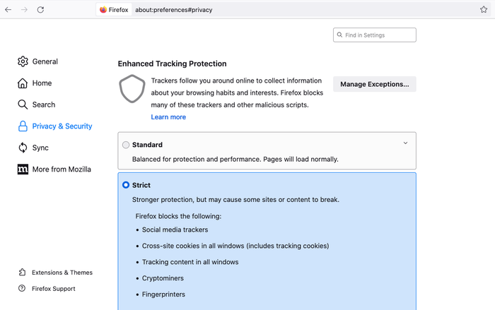 Để kích hoạt tính năng chống theo dõi mới, vào Cài đặt Firefox, nhấp vào Quyền riêng tư & Bảo mật, và chuyển Enhanced Tracking Protection sang Strict.