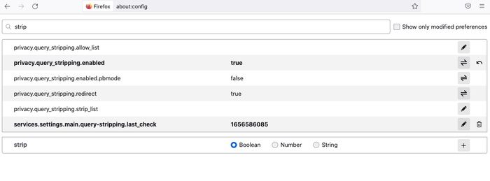 Để kích hoạt tính năng trong Chế độ Riêng tư, nhập “about:config” vào thanh địa chỉ, và sau đó nhập “strip” vào chức năng tìm kiếm. Đặt tùy chọn thứ ba thành “true,” và bạn đã sẵn sàng.