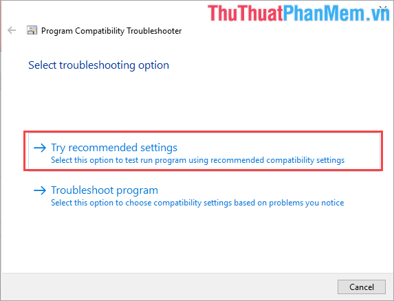 Step 3: The Program Compatibility Troubleshooter window appears, select Try recommended settings.