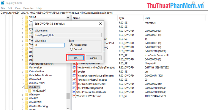 Step 3: Then, click on LoadAppInit_DLLs to make adjustments. Set Value data to 0 and press OK to save the changes.