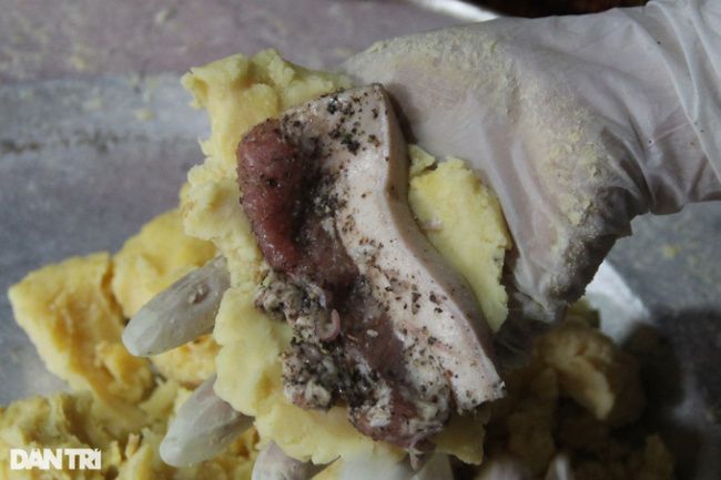 “Sau khi đóng gói, bánh được nấu liên tục trong 7-8 tiếng, sau đó đợi than tắt, nước nguội để bánh nấu chín đều từ bên trong ra ngoài. Nếu lấy bánh khi nước còn nóng, vỏ sẽ bị cháy, màu sắc khác nhau. Bánh không xanh. Bánh được mang ra, rửa sạch và ép hết nước trước khi giao cho khách hàng”, ông Hà chia sẻ.