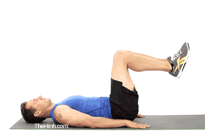1. Nằm trên thảm, mở rộng 2 chân, tay duỗi thẳng theo hai bên người với lòng bàn tay úp. 2. Thở ra, co gối lại gần ngực, căng cơ bụng và nâng lưng lên khỏi sàn.