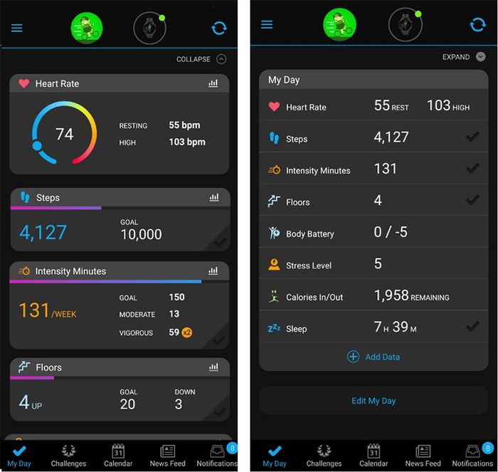 Tính năng mới trên Garmin Connect hiển thị biểu đồ chỉ số quan trọng một cách rõ ràng. Bạn có thể xem chi tiết nhịp tim, số bước, và số bậc thang đã leo.