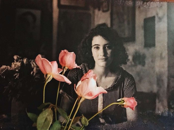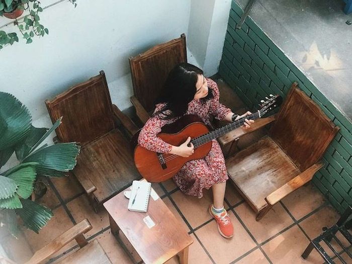 Người phụ nữ ngồi bên cây đàn guitar