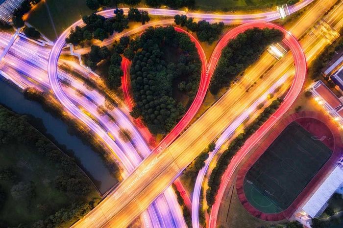 Giao lộ đường cao tốc tạo thành hình trái tim lãng mạn, sáng tạo với sắc màu tươi tắn.