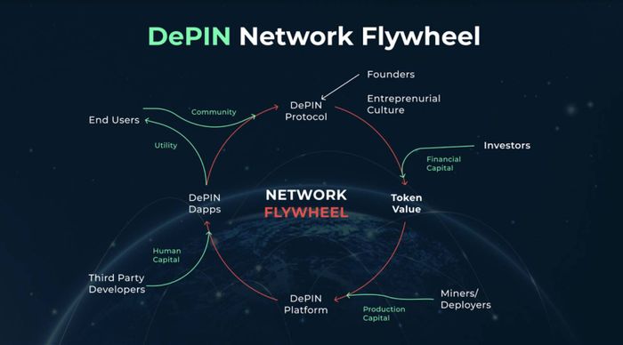 Sau khi mạng lưới cơ sở hạ tầng vật lý phi tập trung được hình thành, nó sẽ thu hút người dùng tham gia sử dụng mạng lưới và đóng góp vào sự phát triển của nó. Những người tham gia xây dựng và vận hành mạng lưới sẽ được chia sẻ phần thưởng là phí của người dùng dưới dạng token. Trong trường hợp tốt nhất, điều này sẽ tạo ra một 'Flywheel', trong đó nhu cầu sử dụng sẽ tiếp tục gia tăng và thúc đẩy sự phát triển hơn nữa của mạng lưới.