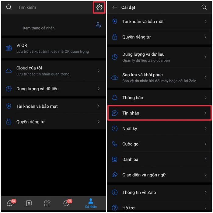 Bước 1: Đầu tiên, bạn truy cập vào ứng dụng Zalo, sau đó nhấn vào mục Cá nhân > nhấn vào biểu tượng răng cưa phía trên cùng bên phải > sau đó bạn hãy nhấn vào mục Tin nhắn.