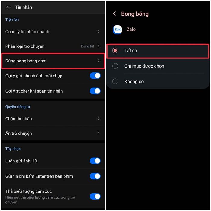 Bước 2: Sau đó, bạn hãy nhấn vào mục Bong bóng chat > tiếp theo, bạn hãy nhấn chọn vào mục Tất cả.