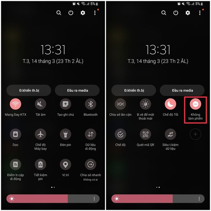 Bạn có thể bật hoặc tắt chế độ này ngay trên thanh thông báo. Nếu khi bạn kéo thanh thông báo xuống mà vẫn không thấy chế độ này, bạn có thể vuốt sang bên trái > sau khi tìm thấy chế độ này, nếu nó đang bật thì bạn hãy nhấn vào để tắt chế độ Không làm phiền đi.