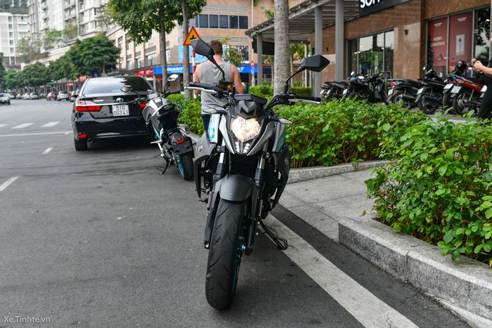 Nhìn bề ngoài, chiếc 250NK có kiểu thiết kế giống mẫu xe KTM Duke 390 với hệ thống đèn đa giác và khung sườn. Phiên bản đặc biệt có màu bạc, xanh lam nhìn khá lạ mắt, còn phiên bản thông thường thì không có các chi tiết màu xanh. Theo thông tin của tôi, CFMoto đánh vào phân khúc 250 cc nên chiếc naked nhỏ nhất được trang bị thêm nhiều tính năng hay ho hơn. Có thể kể đến như: phuộc USD, bảng đồng hồ TFT 2 giao diện theo 2 mode chạy, hốc gió yên sau, dè chắn bùn 1 bên.