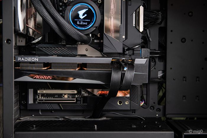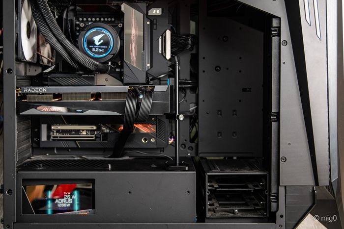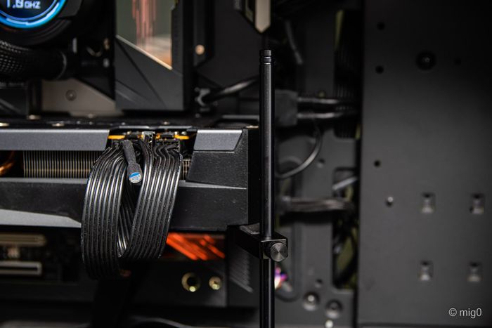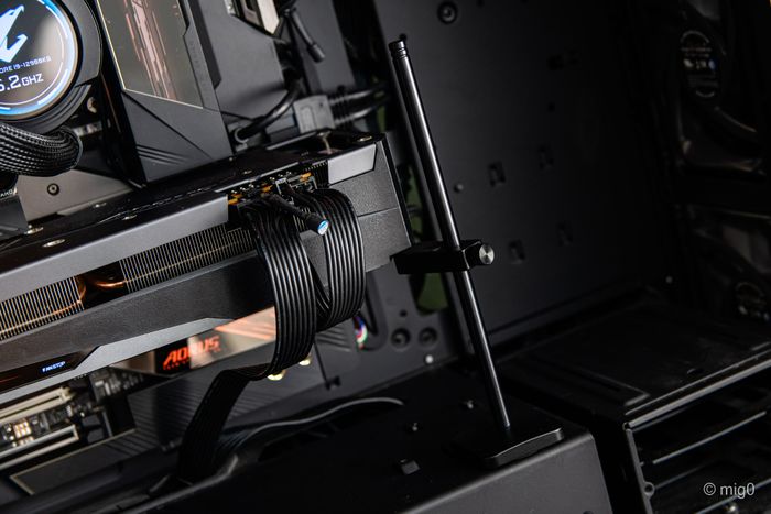 Ấn tượng thay đổi rõ rệt trước và sau khi sử dụng giá đỡ card. RX 6750 XT Elite không quá dài và nặng như RTX 3080 Ti, nhưng vẫn tạo áp lực lên khe PCIe x16 vì phần đuôi card. Trong thời gian sử dụng lâu dài, điều này sẽ không tốt cho cả khe mở rộng và PCB của card đồ họa. Nhẹ thì cong, nặng có thể dẫn đến hư hỏng. Ngoài trọng lượng của chính card đồ họa, các dây nguồn PCIe 6/8 pin cũng đóng góp vào việc kéo đuôi card xuống.