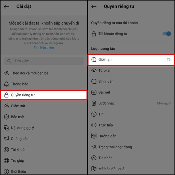 Bước tiếp theo: Trong mục Cài đặt, vào phần Quyền riêng tư và chọn Giới hạn ở phần Quyền riêng tư.