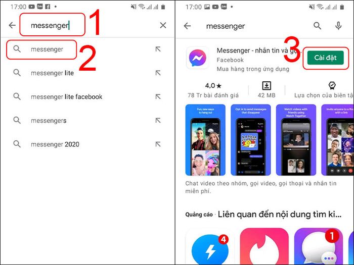 - Đối với điện thoại Android: Truy cập cửa hàng CH Play > Tìm kiếm từ khóa 'messenger' > Chọn ứng dụng Messenger > Trong ứng dụng Messenger, chọn Cài đặt.