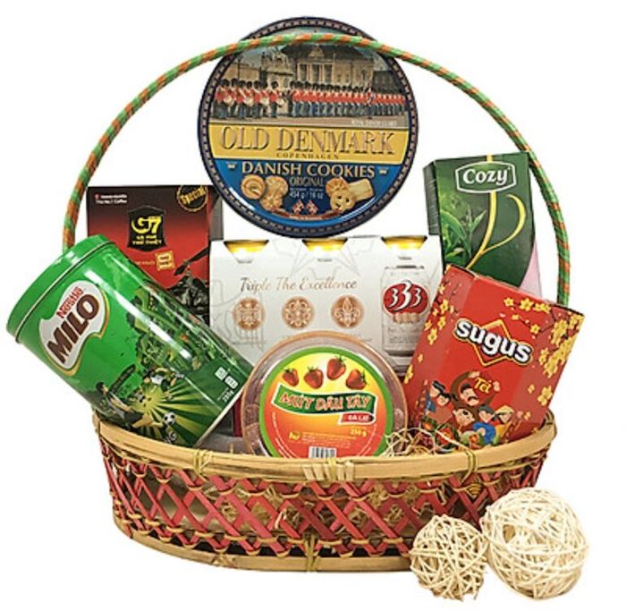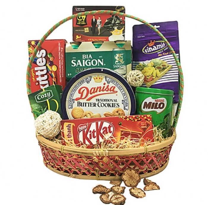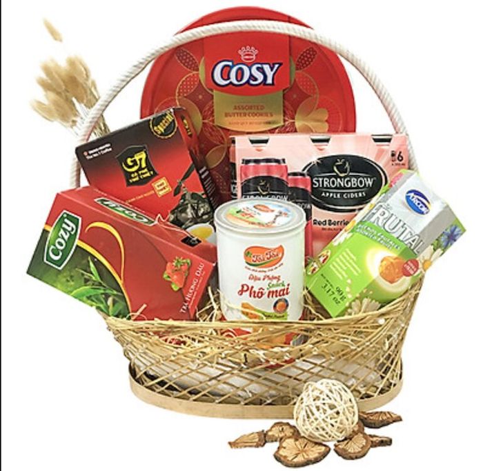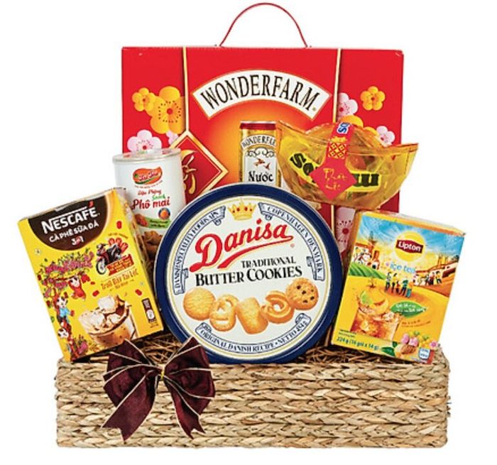 - Giỏ quà tết cơ bản: Bánh kẹo, cà phê, mứt, rượu, hạt dưa, đồ hộp…