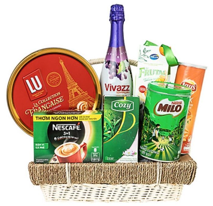 Một chiếc giỏ quà tết thường bao gồm nhiều vật phẩm để tạo ra một món quà ý nghĩa, tượng trưng cho sự sum họp và may mắn trong năm mới. Trong đó có đồ uống như rượu, trà, cà phê để mang lại hạnh phúc và sự an lành.