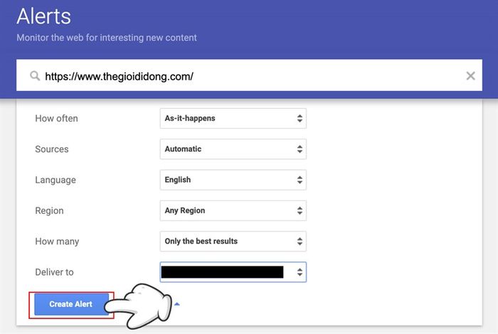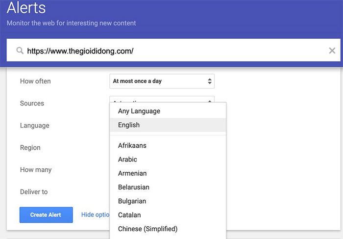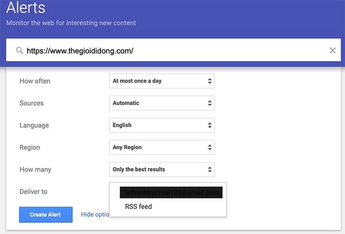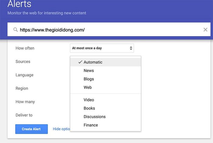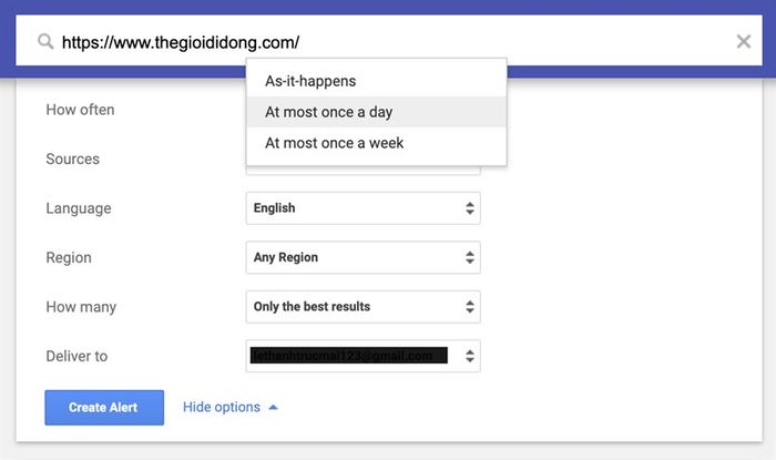Truy cập Google Alerts > Nhập website vào ô tìm kiếm > Chọn More options > Chọn How often > Sources > Language > Region > How many > Deliver to > Create Alert.