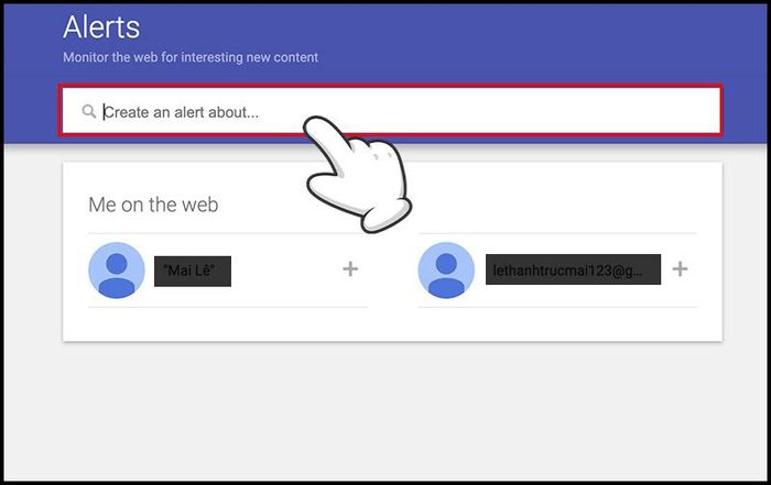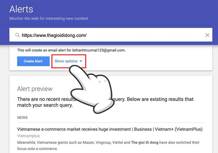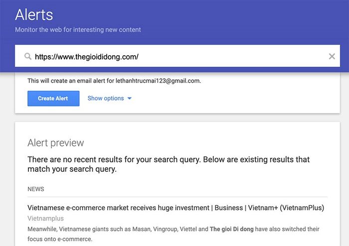 Bước 2: Nhập địa chỉ trang web bạn muốn nhận thông báo mới vào ô tìm kiếm của Google Alert.