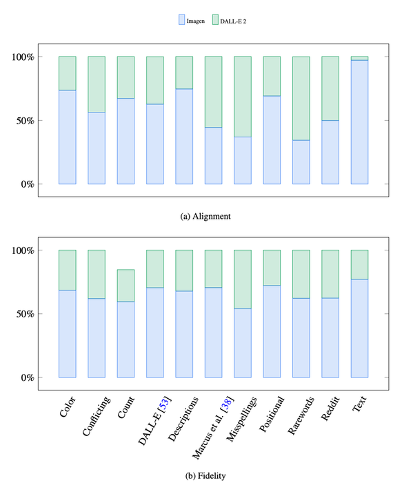 Human raters preferred Imagen over DALLE-2 for both sample quality and image-text alignment. Credit: Saharia et al.mô hình truyền tán phátTrong các thử nghiệm, nhóm Google nói rằng Imagen “đạt hiệu suất đáng kể hơn” DALL-E 2.