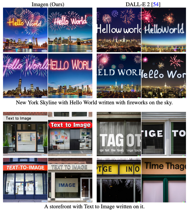 Imagen was significantly better than DALL-E 2 in prompts with quoted text. Credit: Saharia et al.Các nhà nghiên cứu cảnh báo rằng các phương pháp tạo ra có thể lan truyền thông tin sai lệch, kích động quấy rối và làm trầm trọng thêm tình trạng tách biệt.