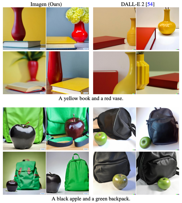 DALL-E 2 can struggle to correctly assign colors to objects — especially for prompts with more than one object. Credit: Saharia et al.Bạn có thể thử nghiệm một số bản demo tương tác tại trang web của Imagen, nhưng chỉ cho phép bạn sử dụng một số cụm từ nhỏ để tạo thành một câu có hạn chế.