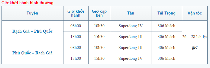 – High-speed boat: Superdong operates sea routes from Rach Gia to Phu Quoc and vice versa. Morning departures at 8:00 AM, and afternoon departures at 1:00 PM, with a sea travel time of 2.5 hours.