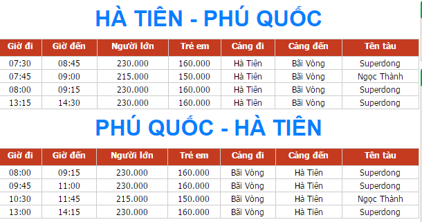 – High-speed boat: Superdong I and Superdong II depart from Ha Tien to Phu Quoc at 8:00 AM and 1:00 PM; from Phu Quoc to Ha Tien at 8:30 AM and 1:30 PM daily. The high-speed boat Hong Tam also operates on this sea route, departing from Ha Tien to Phu Quoc at 1:30 PM and from Phu Quoc to Ha Tien at 8:30 AM daily. The sea journey takes 1 hour and 20 minutes. Some boats for you to choose from: