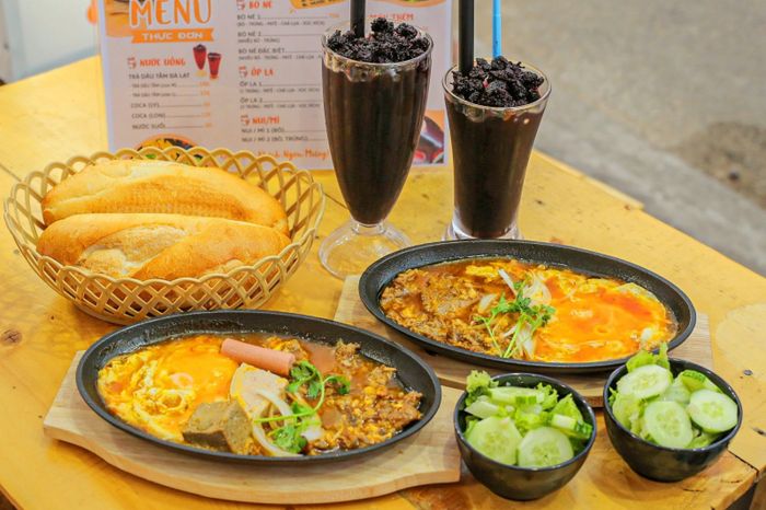 Bụng Bự Quán còn nổi tiếng với món trứng ốp la lòng đào ngon chính hiệu. Thịt mềm, gia vị ngấm đều, ăn kèm với xà lách và tương ớt, tạo hương vị đậm đà. Bàn ghế sạch sẽ, không gian thoải mái. Đĩa salad đẹp mắt với hành tím, ớt đỏ, bánh mì đặc ruột và khoai chiên là điểm nhấn.