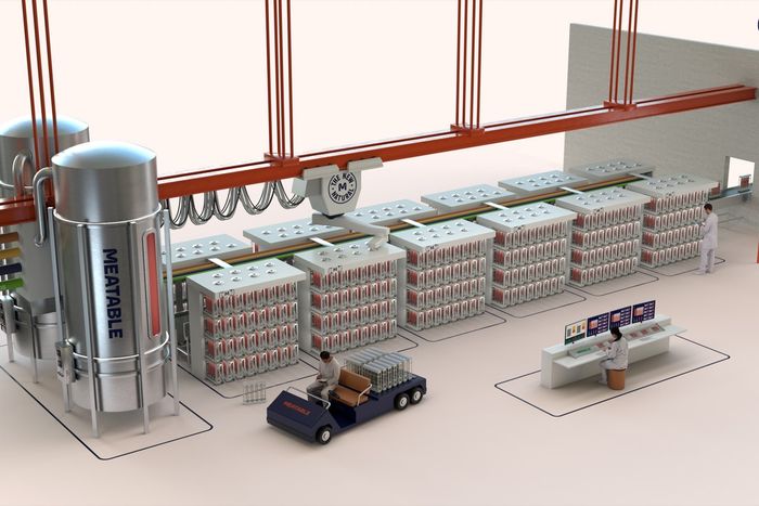 The farm of the future? Credit: MeatableMeatable đầu tiên kích thích một tế bào duy nhất từ dây rốn của một con vật mới sinh, được thu thập mà không gây tổn thương. Hệ thống OPTi-OX độc quyền của công ty sau đó nhanh chóng chuyển đổi các tế bào đa tiềm phong thành các tế bào cơ bắp và mỡ mong muốn.